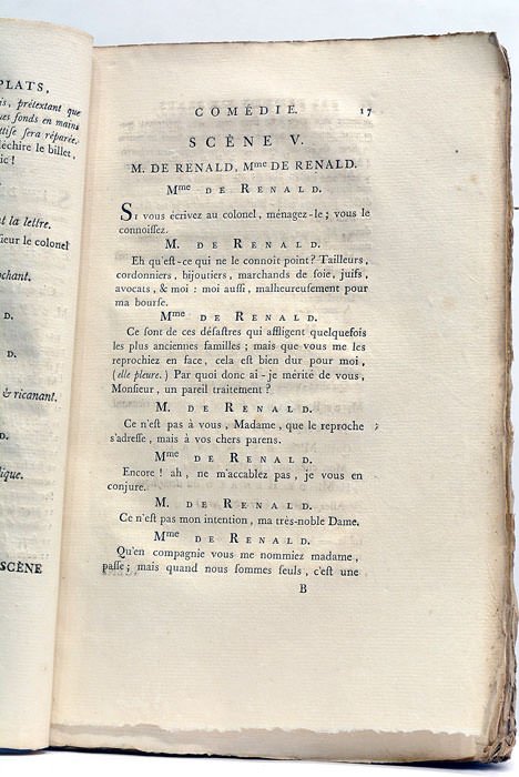1 feuillet. 232 pages. (23x15 Cm). Broché,. Couverture muette ancienne. Étiquette manuscrite au dos. Quelques manques et accrocs. Publié à Paris en 1781 chez L. Cellot, cet ouvrage est la traduction française par Eberts d'une pièce de Gustav Grossmann, figure emblématique du théâtre allemand du XVIIIe siècle, souvent comparé à Shakespeare pour son influence. La pièce, un tableau de famille en cinq actes, reflète les mœurs et les préoccupations sociales de son temps, tout en offrant une fenêtre sur les dynamiques familiales de l'époque. L'édition originale française, non rognée et marquée par le temps avec son papier légèrement bruni et ses rousseurs, témoigne de la circulation des idées et des œuvres culturelles à travers l'Europe du siècle des Lumières.