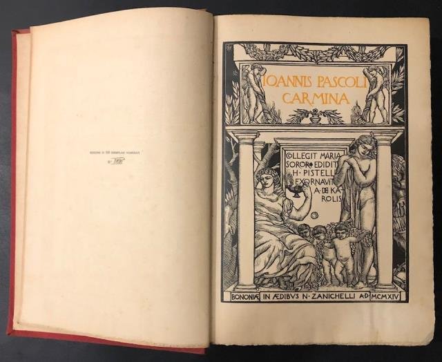 Bologna, Nicola Zanichelli, 1914. Ma in fine si legge: Finito di stampare il giorno 8 marzo 1915 nella tipografia di Augusto Cacciari in Bologna. Questo perché il frontespizio fu preparato in anticipo e reca come anno la data precedente a quella effetiva della stampa che è invece il 1915. Esemplare in tiratura limitata di 500 esemplari numerati e stampato su carta a mano con barbe. Il nostro reca numerazione scritta a mano in numeri romani ed è la copia N °XVIII. In 4to (cm 20 x 29 alla legatura), front. interamente illustrato a p. p. da una xilografia di Adolfo De Karolis, pp. 579 (con Avvetenza a cura di E. P., Note e pagine di Indice), molte grandi xilografie finemente incise, testatine e finali sempre xilograte da De Karolis. Legatura in tutta tela rossa con titoli e decorazioni oro. Giovanni Pascoli (San Mauro di Romagna, 31 dicembre 1855 – Bologna, 6 aprile 1912). Sbiadita la legatura, ritagliato il margine bianco inferiore dell'ultima pagina di testo, peraltro buon esemplare con un interno ottimo, nelle pagine e nell'inciso. .