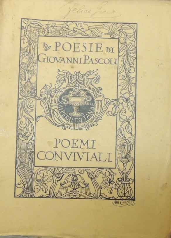 Giovanni Pascoli, Poemi conviviali, Nicola Zanichelli, Bologna 1914, terza ed., pp. XVI, 213, cm 23, br. ed. Esemplare con margini ampissimi stampato su carta forte. Collana Poesie di Giovanni Pascoli, n. 6. Copertina di Adolfo De Carolis. Firma d’appartenenza al margine superiore della prima di copertina, della prima pagina di guardia, e del frontespizio, timbrino d’appartenenza al frontespizio, segnatura di collocazione a lapis alla prima pagina di guardia. Tracce d’uso alla brossura, una piccolissima mancanza al dorso, lievissime fioriture, ma interno molto ben conservato e impreziosito da alcune annotazioni e citazioni manoscritte in bella grafia.