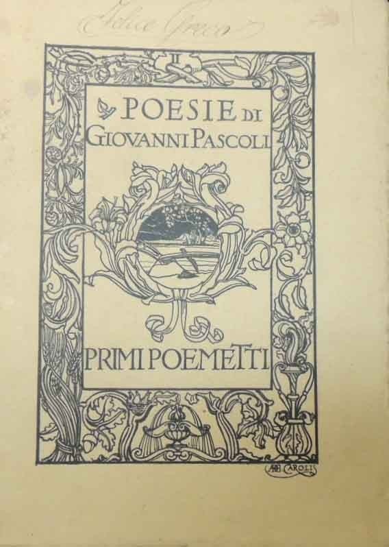 Giovanni Pascoli, Primi poemetti, Nicola Zanichelli, Bologna 1912, quinta ed. definitiva, pp. XX, 218, cm 23, br. ed. Esemplare con margini ampissimi stampato su carta forte. Collana Poesie di Giovanni Pascoli, n. 2. Copertina di Adolfo De Carolis. Firma d’appartenenza al margine superiore della prima di copertina, segnatura di collocazione a lapis alla prima pagina di guardia. Fioriture, qualche sottolineatura eleggera annotazione manoscritta in bella grafia, per il resto molto ben conservato.