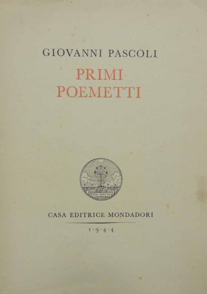 Giovanni Pascoli, Primi poemetti, Casa Editrice Mondadori, Milano 1944, quindicesima ed., pp. XVII, 196, cm 24, br. ed. con sovraccoperta. Collana Poesie di Giovanni Pascoli, vol. 2. Dedica manoscritta alla seconda carta bianca. Leggere tracce d’uso alla sovraccoperta, minime fioriture, lievissima brunitura della carta, per il resto molto ben conservato.