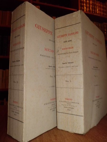 (Pasolini, Pier Desiderio). Giuseppe Pasolini, 1815 - 1876. Torino, Bocca, 1915. Memorie raccolte da suo figlio. Quarta edizione accresciuta dall' autore. 2 volumi in - 8° br., cop. orig. xvi, 537 pp.; (4), 464 pp.; complessive 50 illustrazioni in tavole f.t. ricoperte da veline. Ottimo esemplare (intonso). Uff. Mob 1