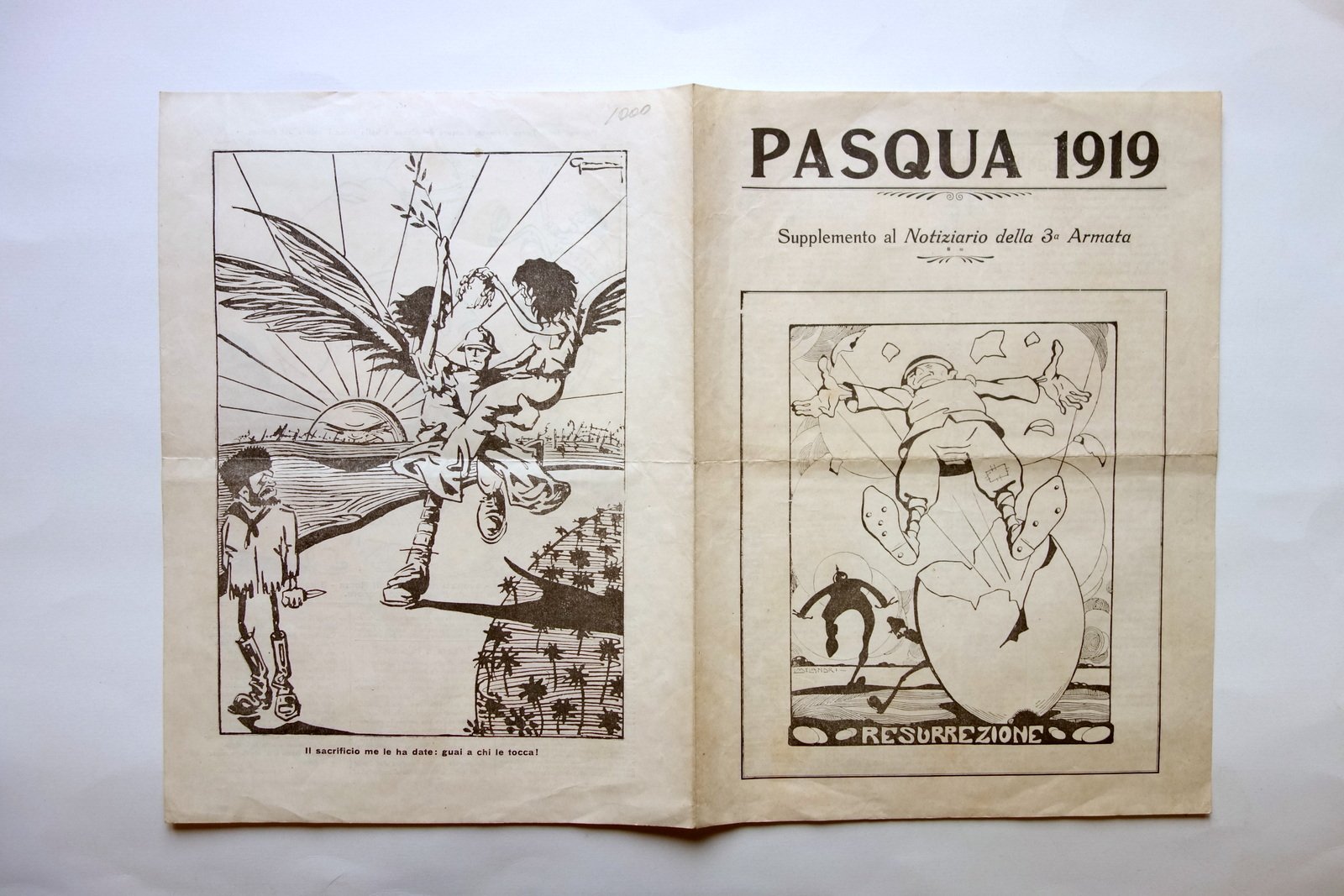 Giornale, Pasqua 1919" resurrezione supplemento al Notiziario della 3° Armata 1919; pp. 4 (bifolio) con ill. in b/n. Numero completo. Cm 38x27,5. Condizioni di conservazione Buone condizioni con tracce d'uso, piega centrale di conservazione. SC03.D17917 N F "