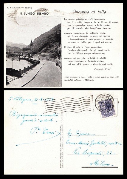 cartolina firmata di Pasquale Trasi con il suo sonetto composto per San Pellegrino Terme "Incontro al bello."; cartolina datata San Pellegrino, 21 Agosto 1958; buon es.