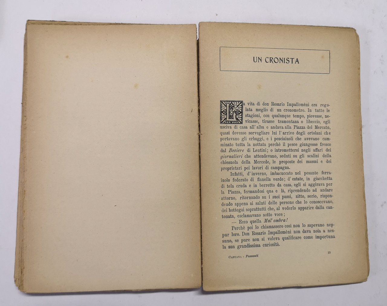 >in-8, pp. 247, (3), broch. edit. figurata. Edizione originale, facente parte della Collezione di Romanzi e Novelle, fondata da Luigi Capuana, VI. Rarissimo. Discreto esemplare, brossura debole e con qualche mancanza alla coperta.