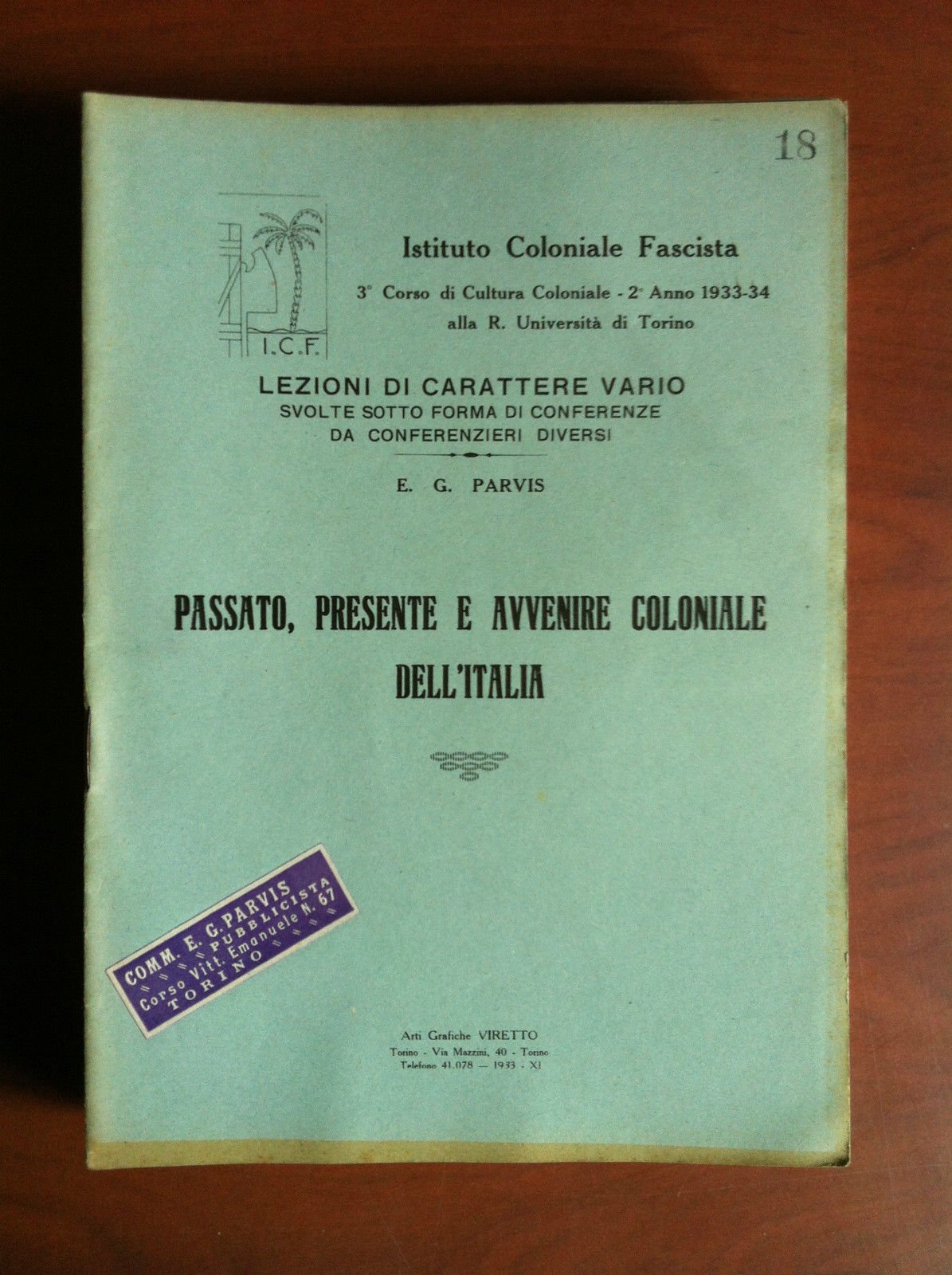 Passato, presente e avvenire coloniale dell'ItaliaE.G. ParvisIstituto Coloniale Fascista3^ Corso di Cultura Coloniale 1933-34 alla R. Università di Torino24 pagine - formato 16,5x23,5 cmin ottimo stato (gr. 45)E9726