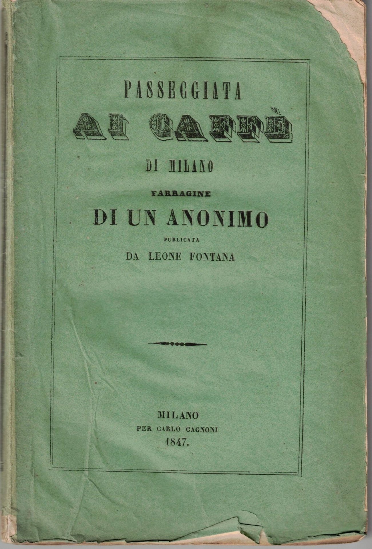 In-16 gr. (mm. 192x122), brossura originale (con fioriture), pp. 97. In forma di dialogo vengono descritti alcuni dei principali caffè di Milano. Cfr. L. Villa, Bibliografia delle Guide di Milano, scheda n. 223 (per una edizione del 1844).Lievi fioriture intercalate nel testo, altrimenti ben conservato.