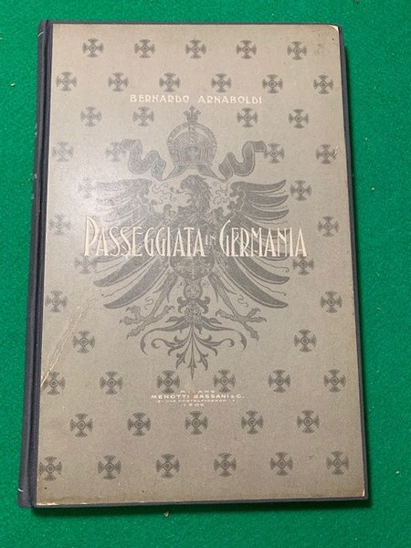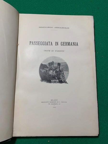 In 4° grande; (4), IV, 291, (5) pp. Legatura in piena-tela editoriale illustrata con titolo al piatto anteriore. Un leggerissimo alone margine esterno bianco delle prime 20 carte, ininfluente e per il resto, nel complesso esemplare in buone-ottime condizioni di conservazione. L'opera racconta il viaggio fatto dall'autore a Stoccarda, Norimberga, Dresda, Lipsia, Berlino, Stettino, Lubecca, Liel, Amburgo, Brema, Hannover, Braunswick, Magdeburgo, Colonia, Düsseldorff, Essen, il Reno da Colonia a Magonza. Giuseppe Bernardo Arnaboldi Gazzaniga (Milano, 2 agosto 1847 - Roma, 24 marzo 1918) è stato un politico italiano liberale, senatore nella XXI legislatura del Regno d'Italia, 1º conte di Pirocco.