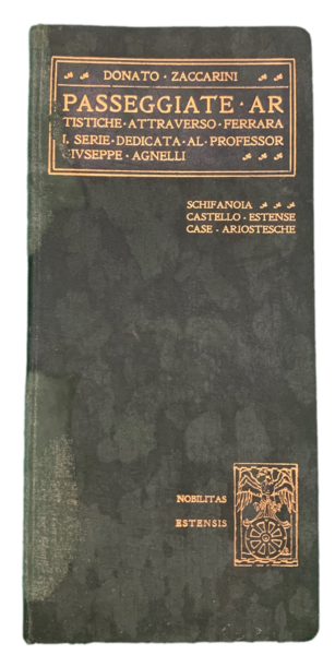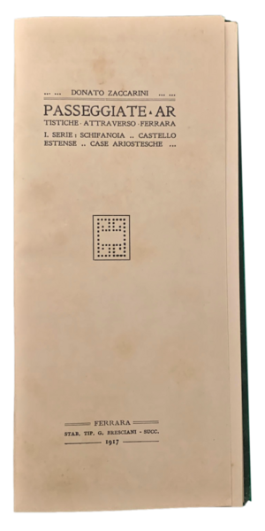 In oblungo (22x10,4 cm); 64, (4) pp. Legatura editoriale in piena tela verde con titolo e autore impressi in oro al piatto anteriore. Qualche lieve scoloritura al piatto anteriore ma nel complesso, esemplare in buone-ottime condizioni di conservazione. Primissima rara edizione di una delle guide ferraresi più apprezzate del novecento. A differenza delle edizioni susseguenti, questa prima edizione datata 1917 è rarissima. Zaccarini fu una figura di primissimo piano nella valorizzazione degli artisti ferraresi e si deve a lui la trasformazione dell'antica dimora ferrarese della famiglia Sacrati, nella Galleria d'Arte Moderna di Ferrara.