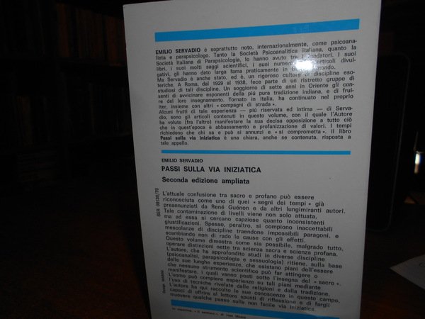 EMILIO SERVADIO. Roma, Edizioni Mediterranee, 1988. Passi sulla Via Iniziatica. Seconda edizione ampliata. In-8°, cart. edit. ill. a col. 237 pp. Come nuovo. Uff. stanzetta mob. piccolo a destra