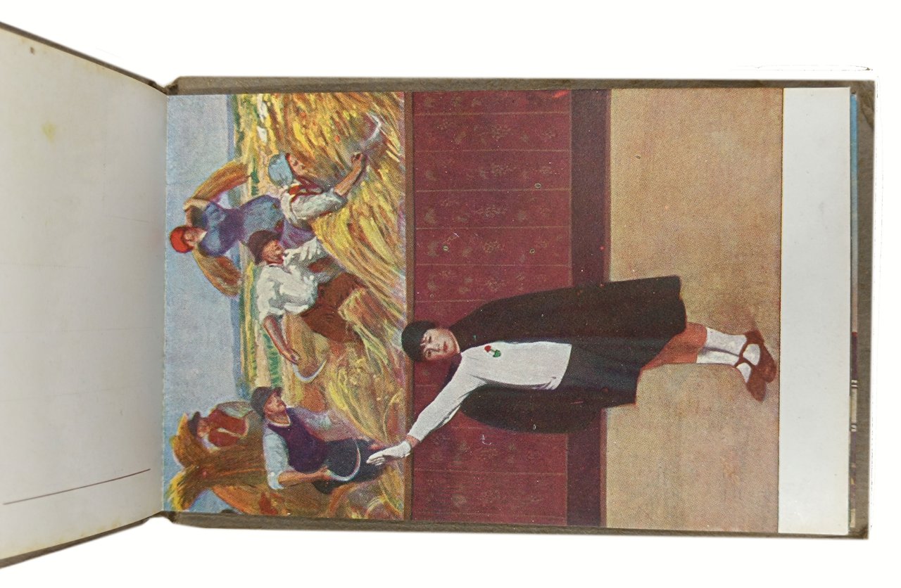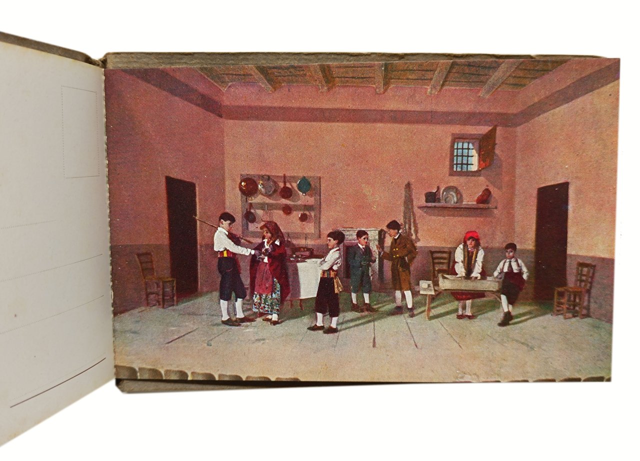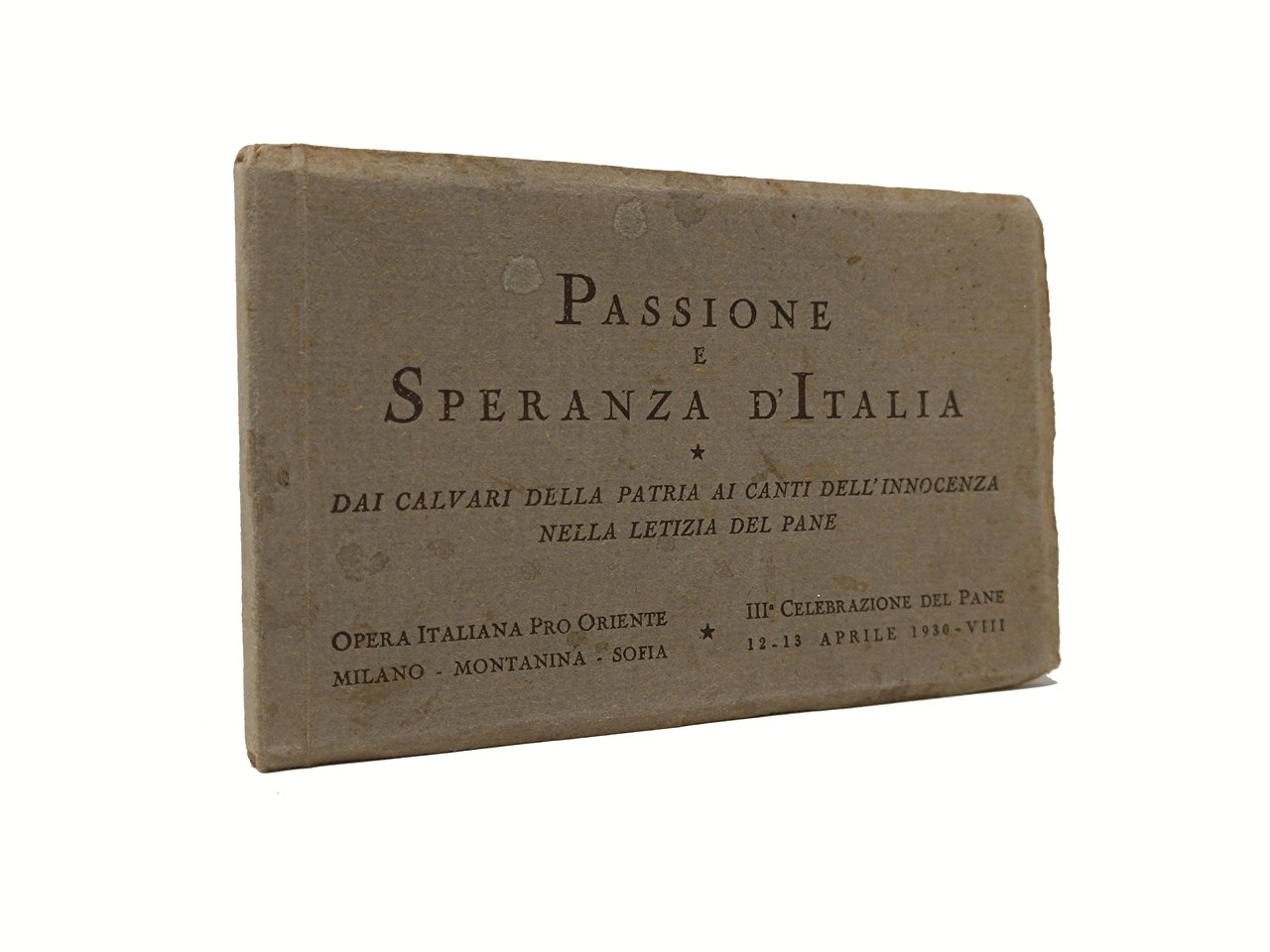 Opera italiana Pro Oriente (Milano - Montanina - Sofia). III° Celebrazione del pane 12 - 13 aprile 1930 - VIII. Cromotipografia Ettore Sormani, Milano. Formato: 15,5 x 9,5 cm circa. 18 cartoline a colori rilegate in un unico volumetto. Stato di conservazione: qualche piccolo alone sulla brossura ma, nel complesso, un buon esemplare. Le cartoline rappresentano monumenti e vedute (Trieste: La Cattedrale di S. Giusto; Il Castello di Trento che vide il martirio di Battisti; La 'Zona Sacra' dell'Eroismo e del Sacrificio - Redipuglia: L'ossario dei Caduti; Il Castello di Rovereto con la 'Campana dei Caduti'; Le tappe della Vittoria: il cimitero di guerra ad Arsiero; I luoghi del Sacrificio e della Vittoria: l'Ossario del Pasubio; Val D'Astico: la vetta del Monte Cimone; Aquileia: Cimitero degli Eroi: Monumento ai Caduti; Aquileia: il Cimitero di Guerra: Tomba dei Dieci Militi Ignoti; Aquileia: la Basilica millenaria; Aquileia: fra i cipressi dormono migliaia di Eroi; Il monumento degli alpini caduti sul Montenero; Roma l'altare della Patria) e momenti della festa del pane (in totale queste ultime sono 6).