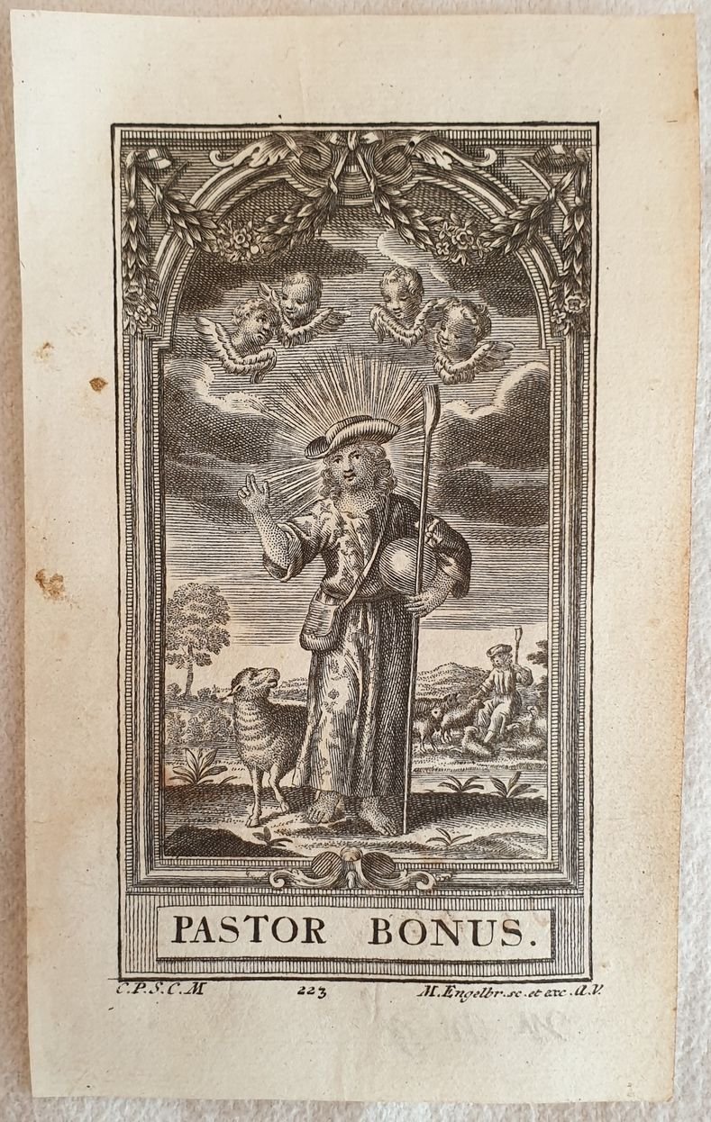 Bella incisione su legno della prima metà del XVIII secolo, il Pastore Buono di Martin Engelbrecht (1684-1756) incisore tedesco barocco. Anticvhe note manoscritte al verso. Dimensioni foglio: mm 145x900. Dimensione incisione al margine: mm 115x65. In ottime condizioni. Qualche lieve fioritura. Wonderful woodcut of the first half of XVIII century, the Good Shepherd engraved by Martin Engelbrecht (1684-1756) baroque german engraver. Ancient handwritten text in the verso Size of the page: mm 145x900 Size in the print: mm 115x65. In good conditions. Some slight foxing