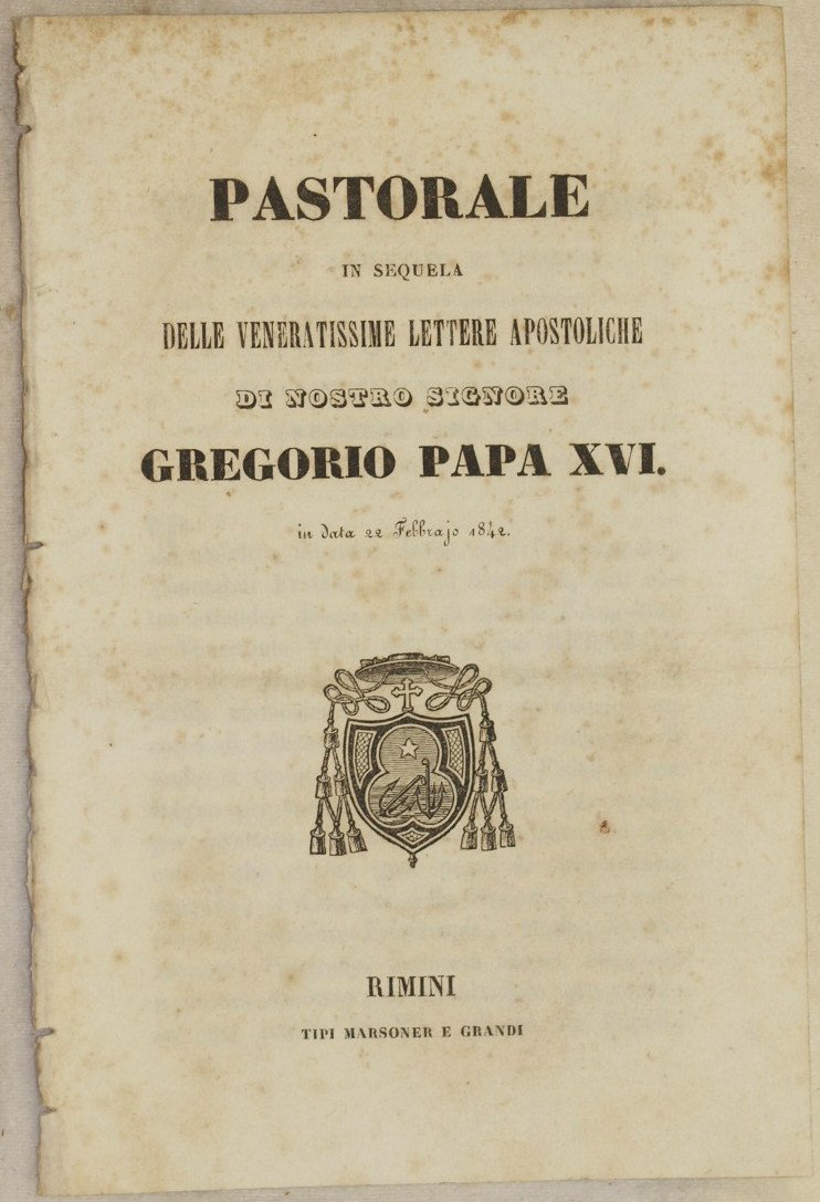 PASTORALE IN SEQUELA DELLE VENERATISSIME LETTERE APOSTOLICHE<BR>DI NOSTRO SIGNORE N GREGORIO PAPA XVI IN DATA 22 FEBBRAIO 1842