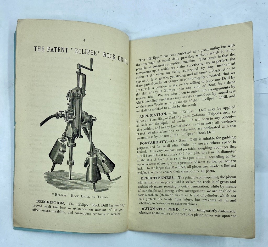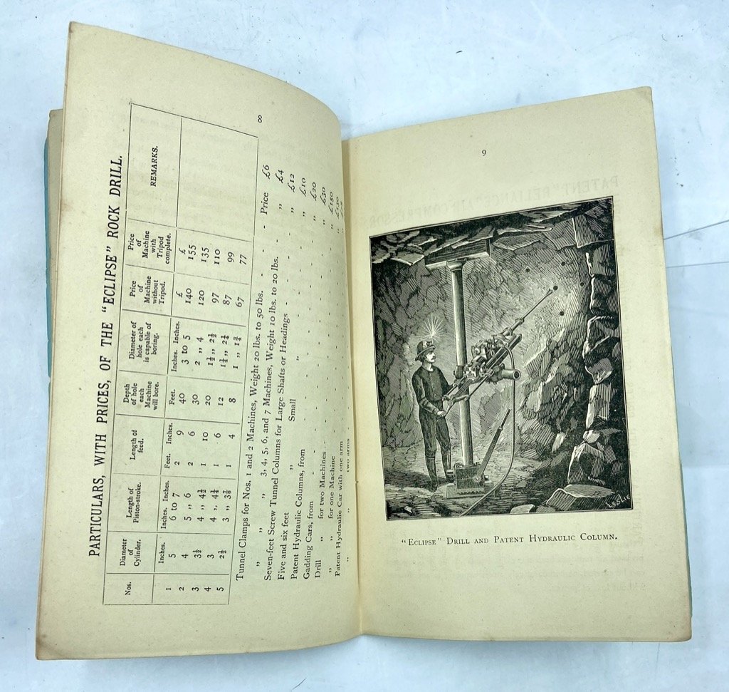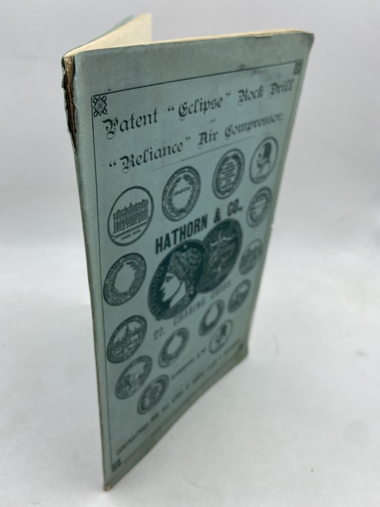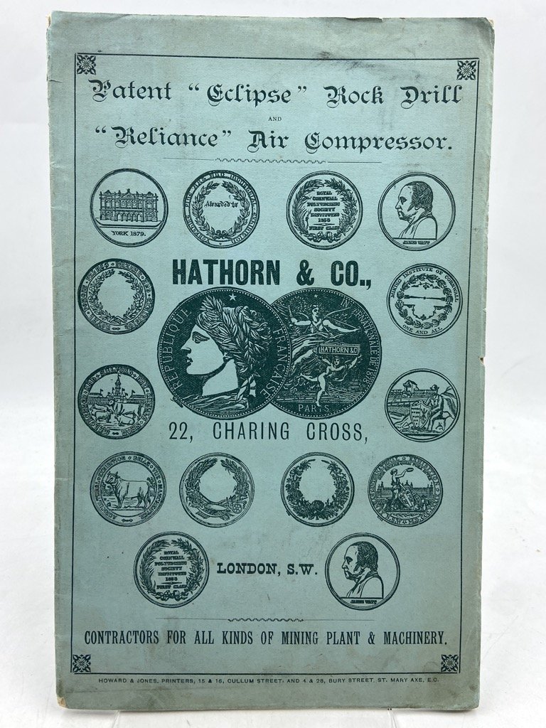 Catalogo commerciale in brossura editoriale illustrata, spillato, copertina in carta azzurra con illustrazioni e testo in verde, in ottavo cm 24.5 x 15.5, pp 24 illustrate in nero. Piccoli difetti sulla brossura. Catalogo commerciale inglese per la ditta di macchinari per l’industria mineraria estrattiva Hathorn & Co di Londra; il fascicolo illustra alcuni macchinari dell’azienda, in particolare il trapano “Eclipse”, mostrato in figura anche montato su carrello e colonna idraulica, il compressore d’aria Reliance e una «Self Filling Machine» per il caricamento dei carrelli da miniera. Oltre alle figure relative alle macchine è presente una tavola con le medaglie vinte dall’azienda, ripetuta anche sui piatti.