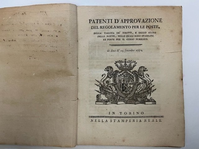 In 8 (cm 20 x 25,5), pp. 53 + (3 bianche). Brossura coeva con annotazione manoscritta al piatto anteriore. Pubblicazione delle Patenti di approvazione del nuovo regolamento per le poste approvato nella data del 19 settembre 1772. A partire da pagina 33, presenti tabelle con tariffa per la tassa delle lettere per il Regno di Sardegna, Ducato di Savoia, Contado di Nizza, Oneglia, Province di Torino, Asti, Alba, Biella, Ivrea, Cuneo, Mondovi', Pinerolo, Saluzzo, Susa, Vercelli, Casale, Acqui, Alessandria, Tortona, Voghera, Aosta, Novarese. con elenco dei comuni per le rispettive province. Manno, p. 159.