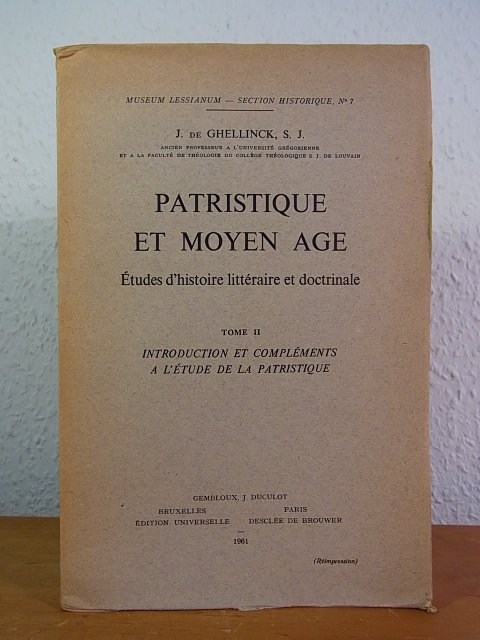 Tomo III: "Compléments à l'étude de la patristique". Collana: "Museum Lessianum - Section historique", vol. 7. Ristampa 1961 dell'edizione 1947. Piccolo timbro di proprietà sulla prima guardia, coperta segnata dal tempo ma complessivamente buone condizioni.