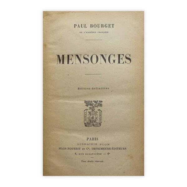 Autore: Paul Bourget Titolo: Mensonges Sottotitolo: Edition définitive Edizione: Paris - Plon-Nourrit, Imprimeurs-Editeurs 1887 Dimensioni: 12 x 18 cm c.a. Pagine: 429 Copertina: Cartonato Condizioni: Ottime come da foto