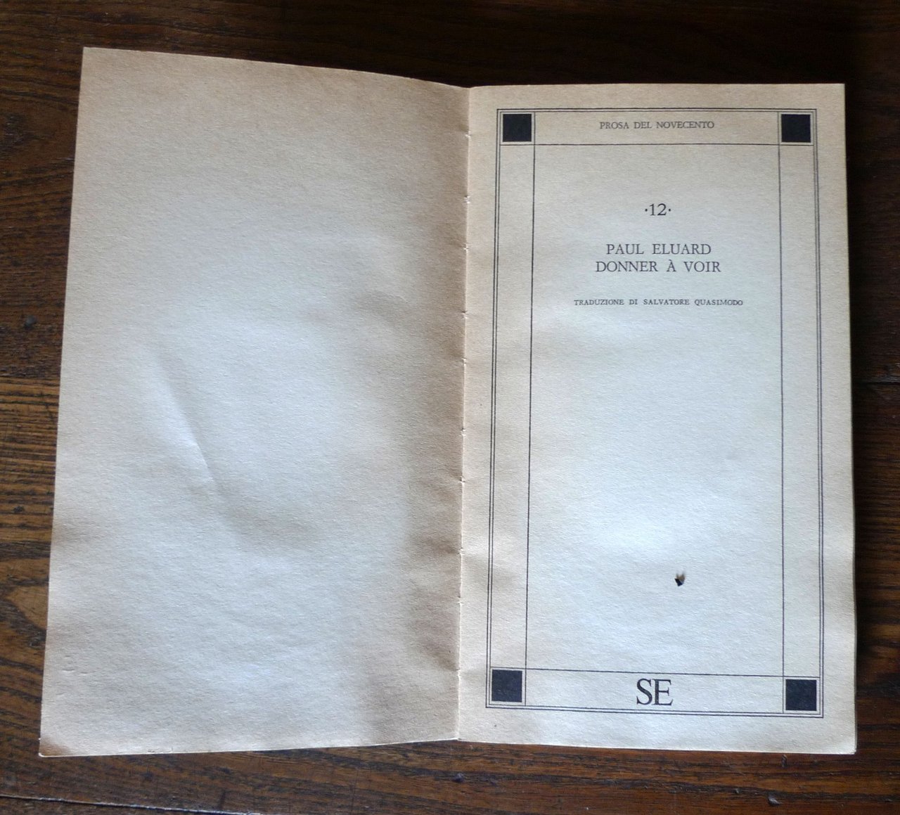 Paul Eluard,DONNER À VOIR.Traduzione di Salvatore Quasimodo.SE Studio Editoriale, Milano 1988,brossura, 22x13 cm., pp.208,alcune poesie sono in lingua originalefrancese con traduzione italiana a fronte,PROSA DEL NOVECENTO / 12ISBN: 88-7710-103-2,peso: g.400cod.9516CONDIZIONI DEL LIBRO: buone,imperfezioni alla copertina,pagine ingiallite,scritta a matita all'occhiello,firma e data a penna in 2 pagine