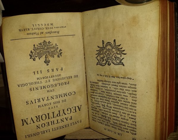 In-8 (19,3 cm) 3 parti in 1 volume. (12) 304, (8) 276, (18) 208 CLVI (34) Marca editoriale diversa ai tre frontespizi. Numerose testatine, capolettera e finalini incisi. Piena pelle con fregi dorati al dorso e contropiatti rivestiti di carta marmorizata. Prolegomena (p. [I!-CLVI) segue pt. 3. Fregi ed iniziali xil Jablonski, Paul Ernst (1693-1757). Ultima pagina bianca manoscritta.