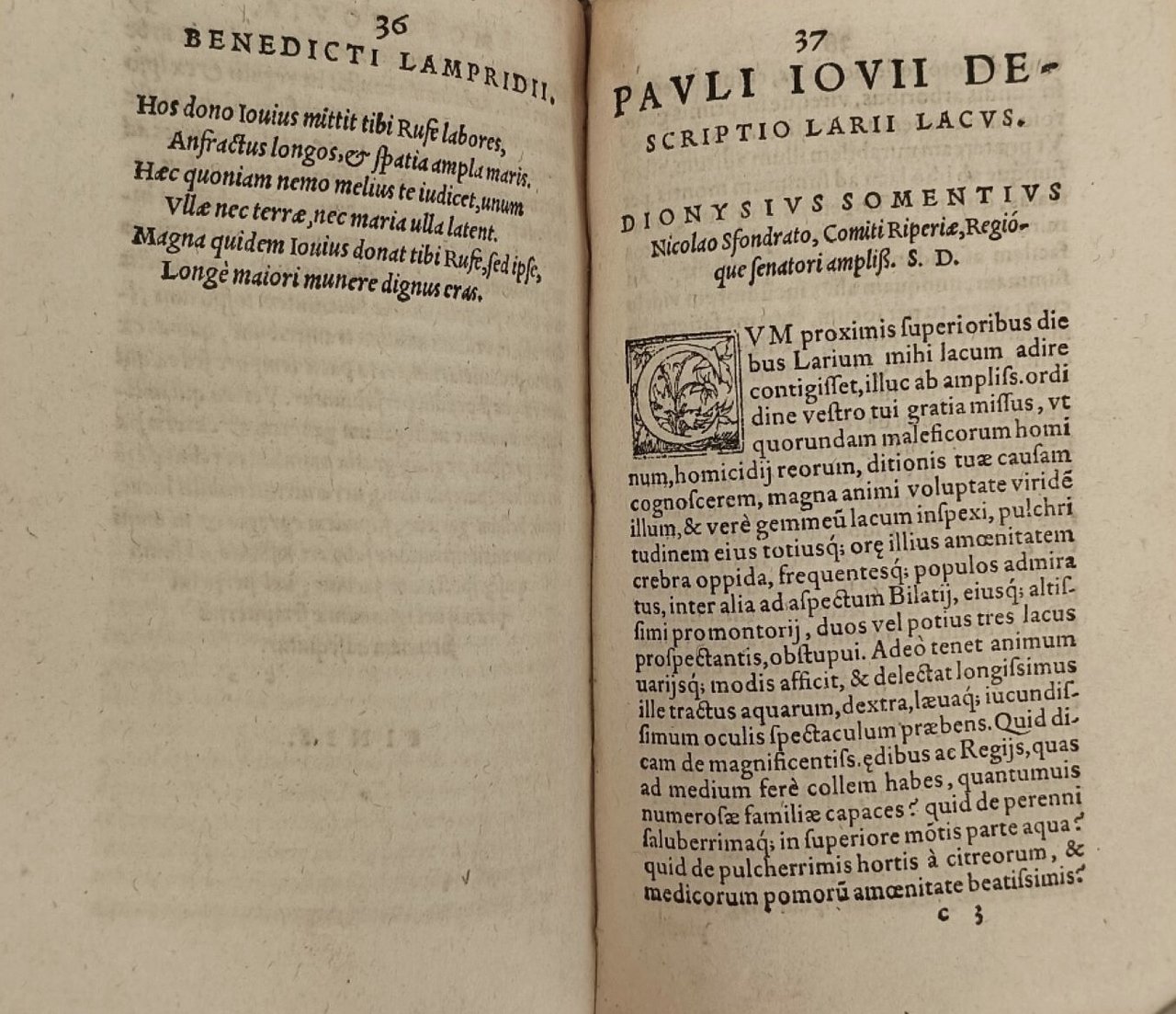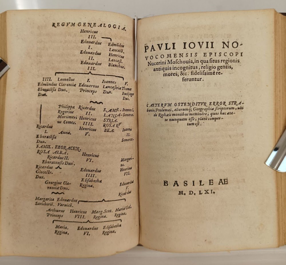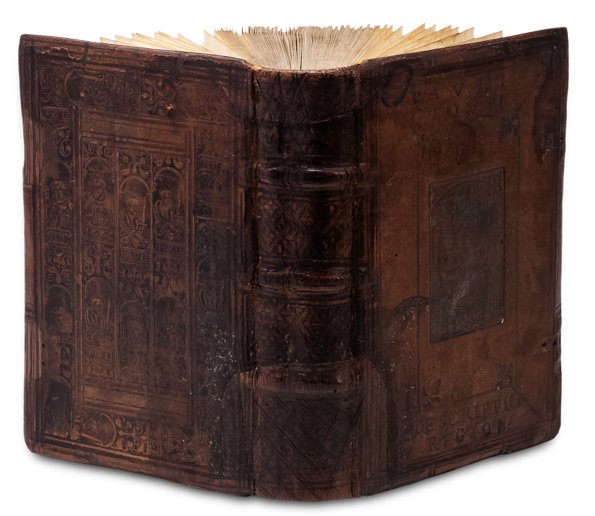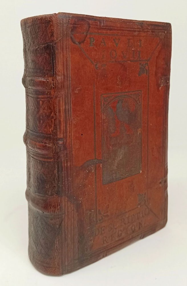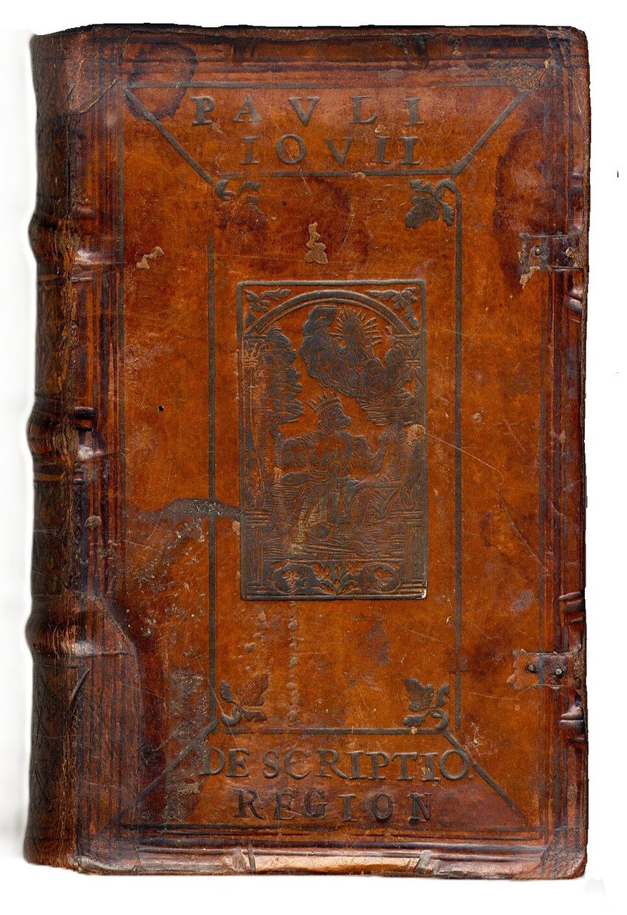 >in-8, (156x95 mm), pp. (16), 239, 180, (10), bella legatura tedesca in cuoio su assicelle, riccamente decorata a secco: il piatto anteriore con nome dell'autore e parte del titolo “Descriptio Region” in capitali e placca raffigurante l'apparizione di Dio a Re David; il piatto posteriore arricchito sia nel pannello centrale sia nella bordura da ritratti alternati dei Santi Pietro e Paolo. Dorso a quattro scomparti con fregi incrociati, quello inferiore e metà di quello superiore abilmente rifatti e reimpressi, con estensione del restauro in alto e in basso su porzione di entrambi i piatti; tracce di fermagli, sguardie rifatte . Nota di possesso Fr Stockari (un Jacob - probabilmente il padre - fu praetoris optimi di Locarno). Bella edizione a cura di Johannes Basilius Herold, che firma la lettera dedicatoria; riunisce operette di ambito storico-geografico di notevole interesse, minori soltanto in quanto a lunghezza del testo. La prima parte è la più cospicua e comprende la descrizione di Inghilterra, Irlanda e Scozia, gli elogi di alcuni notabili britannici e una cronologia dei Re e si spinge a descrivere perfino le isole Orcadi. Questo dettaglio è stato considerato un tentativo da parte del vescovo comasco di riavvicinare l'Inghilterra alla Chiesa cattolica: i suoi rapporti con molti riformatori suggerisce qualche significativo adattamento da parte sua allo spirito dei tempi. Inusuale è la seconda parte, che tratta della Russia, ovvero “Moschovia, in qua situs regionis antiquis incognitus, religio gentis, mores”: geografia ed etnologia s'intrecciano con la descrizione storica, facendo emergere un mondo poco conosciuto attraverso una vivace narrazione sugli usi, costumi e curiosità. Ha frontespizio proprio, ma da p. 37 ha inizio la “Desciptio Larii Lacus”, dedicata a Francesco Sfondrati: l'opera si presenta sotto forma di una lunga lettera all'amico che fornisce tutte le notizie sulla storia, il clima e il paesaggio di Como e dintorni. È in assoluto la prima descrizione dettagliata del lago di Como. Il volume si chiude con il trattato De romanis piscibus, che testimonia il suo amore per la buona tavola. Dedicata nel 1524 al cardinale Ludovico di Borbone è in realtà una compiaciuta rassegna di prelibatezze gastronomiche, di metodi di cottura e condimenti del pesce, frutto, più ancora che della sua competenza di medico, della sua esperienza di buongustaio (BING 952, altra edizione). Bell'esemplare su carta forte, nota di possesso di ambito svizzero con data 1719 al titolo, lievissimo alone all'angolo superiore di qualche foglio. USTC 602783.