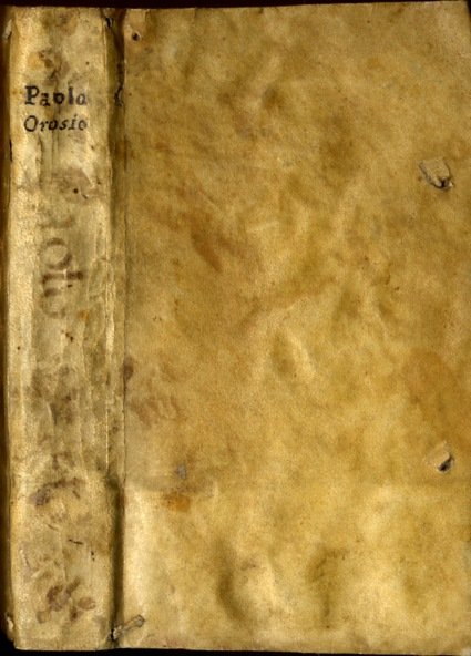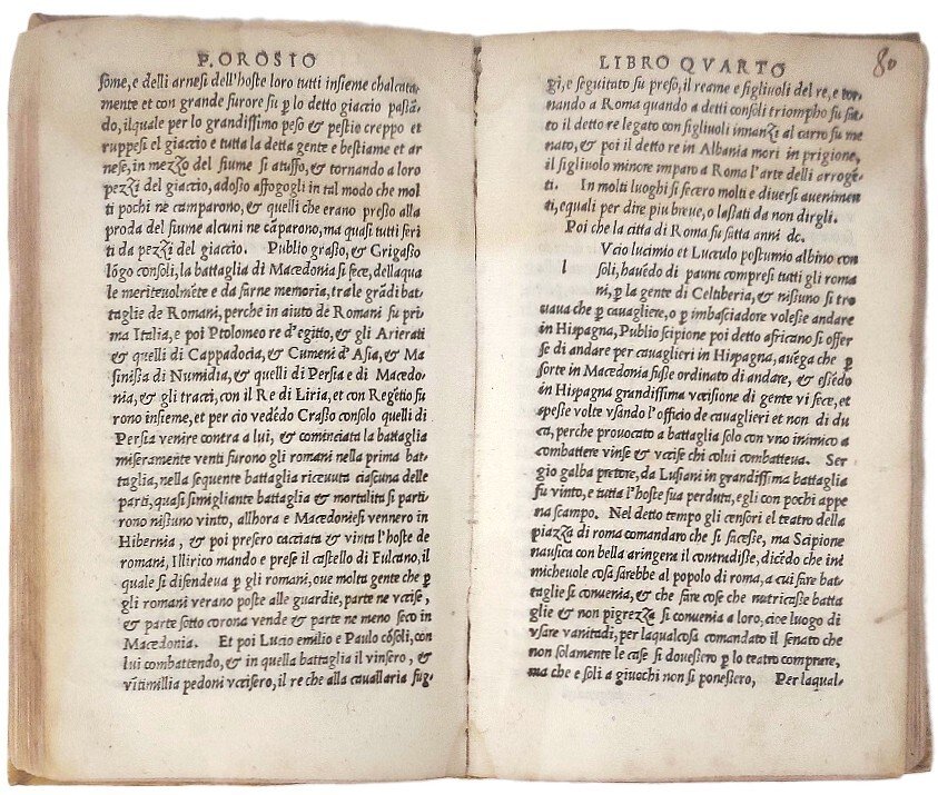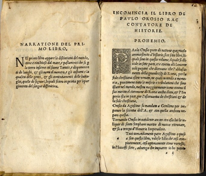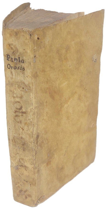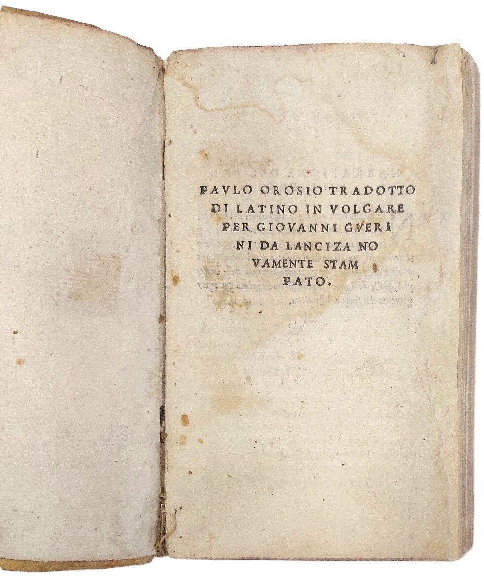 >In-8 (150x90 mm), cc. 172 nn. (numerazione ms. aggiunta da mano coeva) buona legatura coeva in pergamena floscia, titolo ms. al dorso, tracce di legacci. Al colophon, riquadrato in nero, il nome dello stampatore Alessandro Paganino. Edizione originale di questa prima traduzione in volgare delle "Historiae adversus Paganos" (per la data si veda l'ambia bibliografia). L'Autore fu discepolo e collaboratore di Agostino d'Ippona, su invito del quale redasse la presente opera, i "Sette libri delle storie contro i pagani", che dovevano servire da complemento storiografico al De civitate Dei. Buon esemplare, foglio di titolo rimarginato, lieve alone d'umido al margine superiore, forellino al margine esterno del primo foglio . All'ultima carta e alla sguardia indice anticamente manoscritto dal proprietario. Palau V 377; Eduard Toda 3628; Dura 11663. Haym 26-7; * Baroncelli 53; *Lechi 106 * Ebert 15257; *Angela nuovo p.189; *Capponi 277; * Choix 16131; *Graesse V 5; * Argelati IV 117; * Paitoni III 42;* Manzoni 2546 * Adams O 311; * Bm.Stc. 478.[f82] Libro. Aless. Paganini tipografo Toscolano, Catalogo 2008.