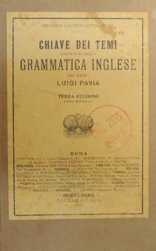 Luigi Pavia, Chiave dei temi contenuti nella grammatica inglese, Giulio Gross, Heidelberg 1910, terza ed., pp. 117, cm 20, cart. ed. con titoli su tasseli di carta applicati al piatto e al dorso. Timbro al piatto anteriore, firma d’appartenenza alla prima pagina di testo, uno strappetto al dorso, minime abrasioni ai piatti, per il resto ben conservato.