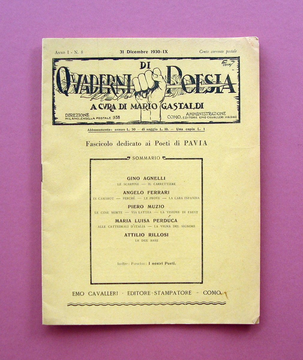 Pavia Quaderni di Poesia Anno I N 8 1930 fascicolo monografico Poeti di Pavia