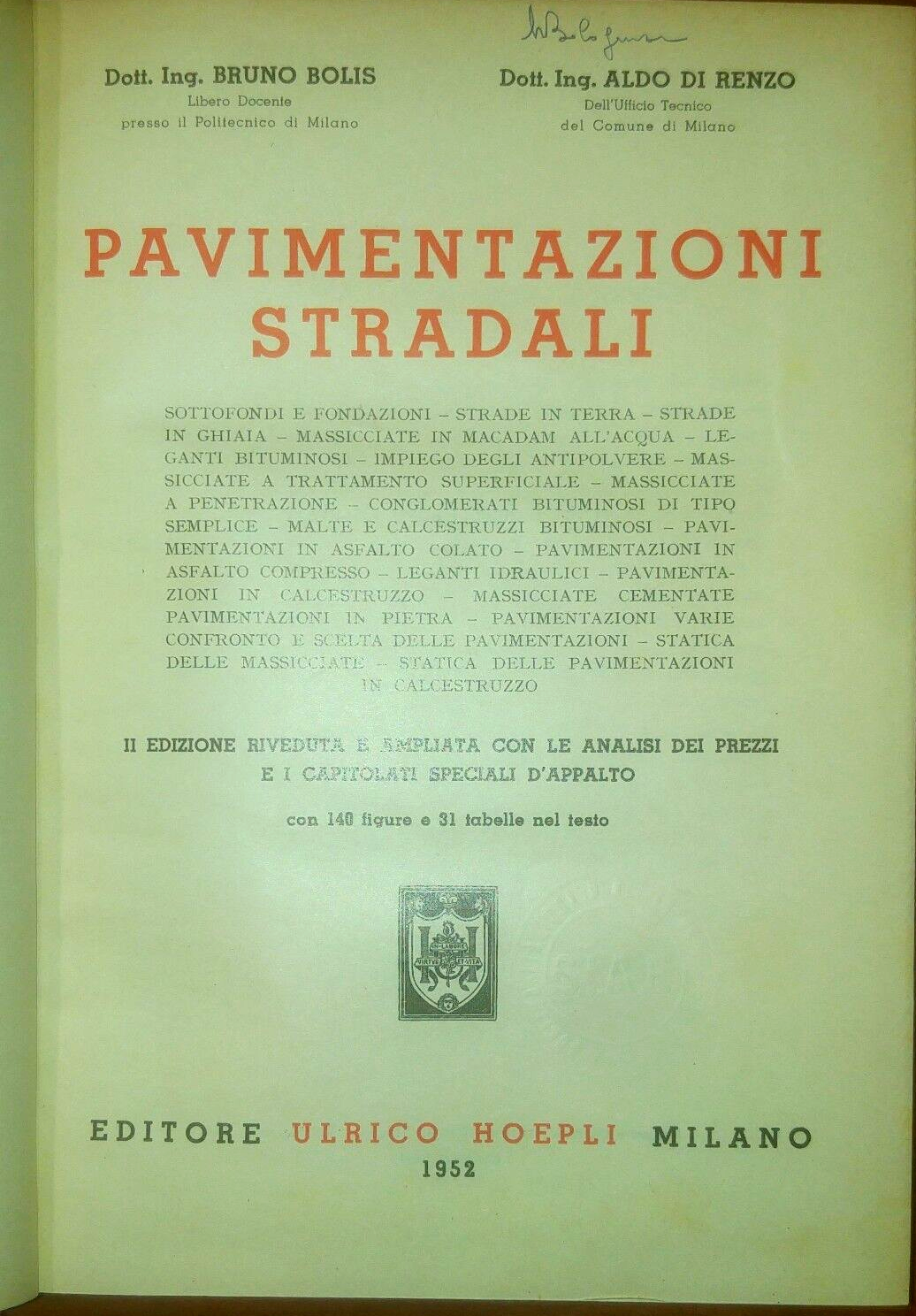 PAVIMENTAZIONI STRADALI di Bruno Bolis Aldo Di Renzo. Ulrico Hoepli Editore II edizione riveduta e ampliata, 1952.