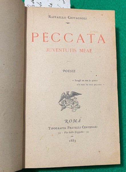 In 12°; (7), 258, (6) pp. Legatura coeva in mezza pelle verde con titolo, autori e ricchi fregi in oro al dorso. Piatti foderati con carta marmorizzata coeva. Frontespizio in rosso e nero. Ricchiessime testatine, finalini ed iniziali in rosso e nero. Tiratura limitata di 2.500 esemplari "Stampato a Roma addì 25 maggio 1883 nella tipografia dei fratelli Centenari, con inchiostro della Ditta Francesco Orsenigo, con caratteri della Fonderia Rayper, sopra carta di Romagnano-Sesia, in edizione di 2.500 copie". Due piccoli difetti della carta con forellino che tocca alcune lettere da pagina 81 a pagina 84 e per il resto esemplare in buone condizioni di conservazione. Prima edizione di questa raccolta di versi del noto patrioto, politico anticlericale e convinto fautore di una società laica, massone e patriota italiano, Raffaello Giovagnoli (Roma, 13 maggio 1838 Roma, 15 luglio 1915).