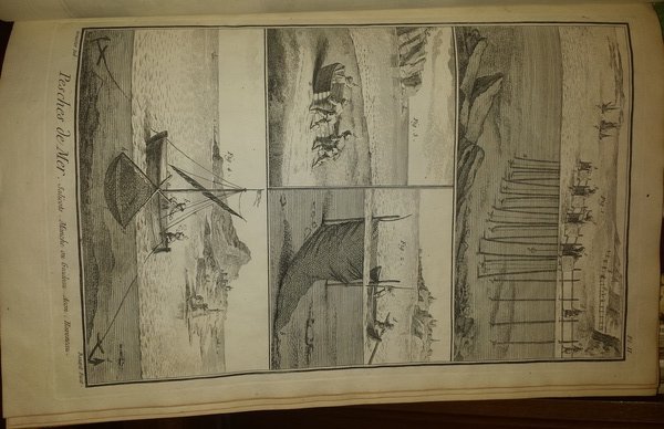 In-folio (39,5 cm) 9 (1) XXXV c. (di tav.) Cartoncino con carta marmorizzata. Tavole incise da Benard e disegnate da Groussier. Proviene da Encyclopédie ou Dictionnaire raisonné des sciences, des arts et des métiers, opera enciclopedica in 35 voll., di cui 11 di tavole, pubblicata a Parigi tra il 1751 e il 1772. Diretta da D. Diderot, intendeva esporre i progressi compiuti dall'umanità in tutti i campi, con particolare riguardo alla tecnica. Le voci furono scritte da letterati, specialisti, medici e ingegneri, tra cui J.-B. D'Alembert, Voltaire, C. Montesquieu, J.-J. Rousseau, E. Condillac. Lingua francese