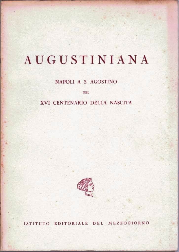 Augustiniana. Napoli a S. Agostino nel XVI centenario della nascita, Istituto Editoriale del Mezzogiorno, Napoli 1955, pp. 270, in antiporta 1 c. di tav. f.t. ill. b.n., cm 24, br. ed. Indice: PP. Agostiniani, Prefazione – Ciriaco Pedicini, Le manifestazioni agostiniane di Napoli e il loro significato – Pietro Romanelli, S. Agostino nell’Africa del suo tempo – Francesco Arnaldi, S. Agostino nella storia della cultura antica – Michele Pellegrino, S. Agostino visto dal suo primo biografo Possidio – Onorato Tescari, Verità e fantasia nella vita di S. Agostino anteriormente alla sua conversione – Ludovico De Simone, La vita e l’opera di S. Agostino nei suoi ultimi anni – Carlo Boyer, Come S. Agostino ha trovato Dio – Francesco Di Capua, S. Agostino poeta – Ugo Mariani, S. Agostino oratore e scrittore – Vincenzo Cilento, Lo spirito poetico e la novità dell’opera agostiniana – Paolo Brezzi, Il carattere ed il significato della storia nel pensiero di S. Agostino – Ugo Mariani, Lo Stato nella concezione di S. Agostino – Valerio Mariani, L’arte in S. agostino – Giuseppe De Rosa, L’Immacolato Concepimento di Maria negli scritti di S. Agostino – Mario Bendiscioli, L’Agostinismo dei riformatori protestanti – Giuseppe De Giovanni, L’attualità di S. Agostino. Minime fioriture, lieve brunitura della carta, per il resto ottimo.