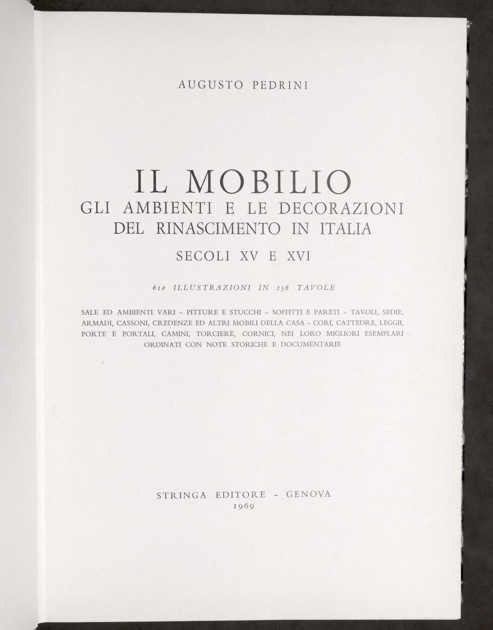 Augusto Pedrini Il mobilio - Gli ambienti e le decorazioni del Rinascimento in Italia - secoli XV e XVI Genova, Stringa, 1969 Pag. 256 in gran parte illustratre. Copertina rigida - Testo in italiano. Condizioni molto buone. Piccoli segni del tempo alla sovraccoperta.