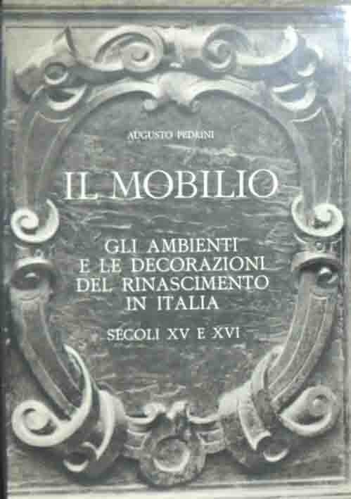 Augusto Pedrini, Il mobilio. Gli ambienti e le decorazioni del Rinascimento in Italia. Secoli XV e XVI. Sale ed ambienti vari. Pitture e stucchi. Soffitti e pareti. Tavoli, sedie, armadi, cassoni, credenze ed altri mobili della casa. Cori, cattedre, leggii, porte e portali, camini, torciere, cornici, nei loro migliori esemplari ordinati con note storiche e documentarie, Stringa Editore, Genova 1969, pp. X, 256, interamente ill. b.n., cm 35, tela ed. con titoli in oro al dorso e al piatto e sovraccoperta. Minima ingiallitura della carta, per il resto ben conservato.