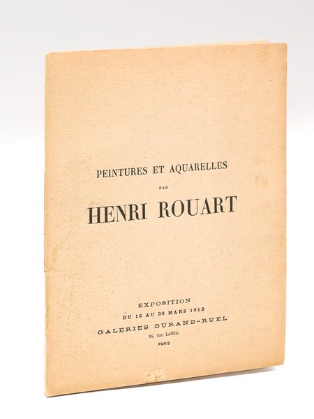 1 brochure in-8, Peintures et Aquarelles par Henri Rouart. Exposition du 16 au 30 mars 1912. Galerie Durand-Ruel 16 rue Lafitte, Imp. de l'Art. Ch. Berger, Paris, 20 pp. (notice d'Arsène Alexandre et catalogue de 143 numéros, avec nombreuses indications de provenance) Très rare exemplaire du catalogue de l'Exposition de 1912 organisé chez Durand-Ruel, au lendemain de la mort du peintre. Il s'agissait de la première rétrospective consacrée à Henri Rouart. En décembre 1912, ses enfant décidèrent de la vente de la collection qui rapporta une somme fabuleuse et lança l'envol des prix des tableaux impressionnistes. Bon état (couv. très lég. frottée)