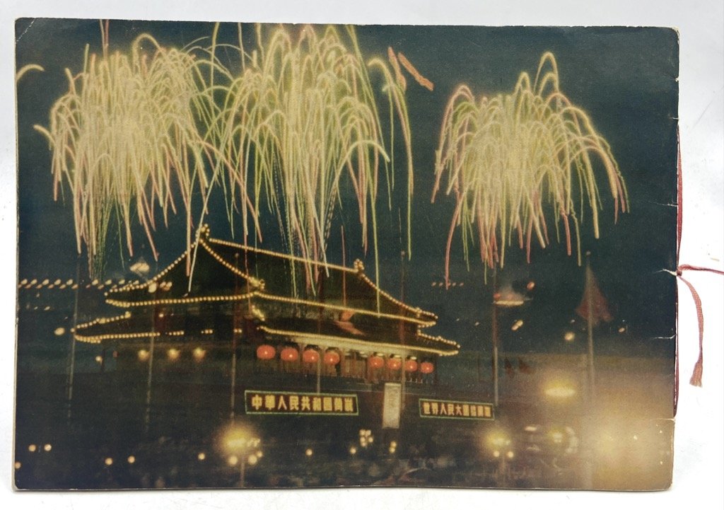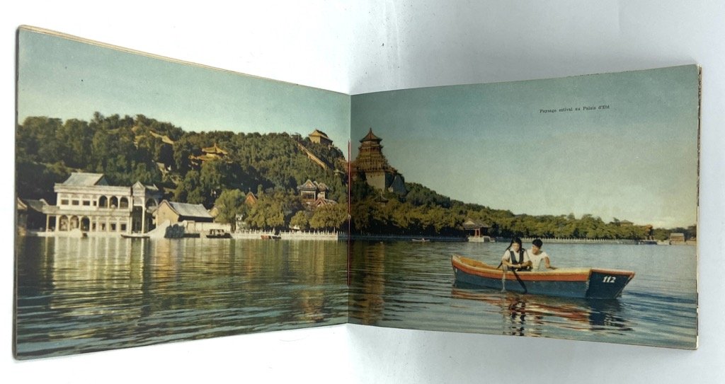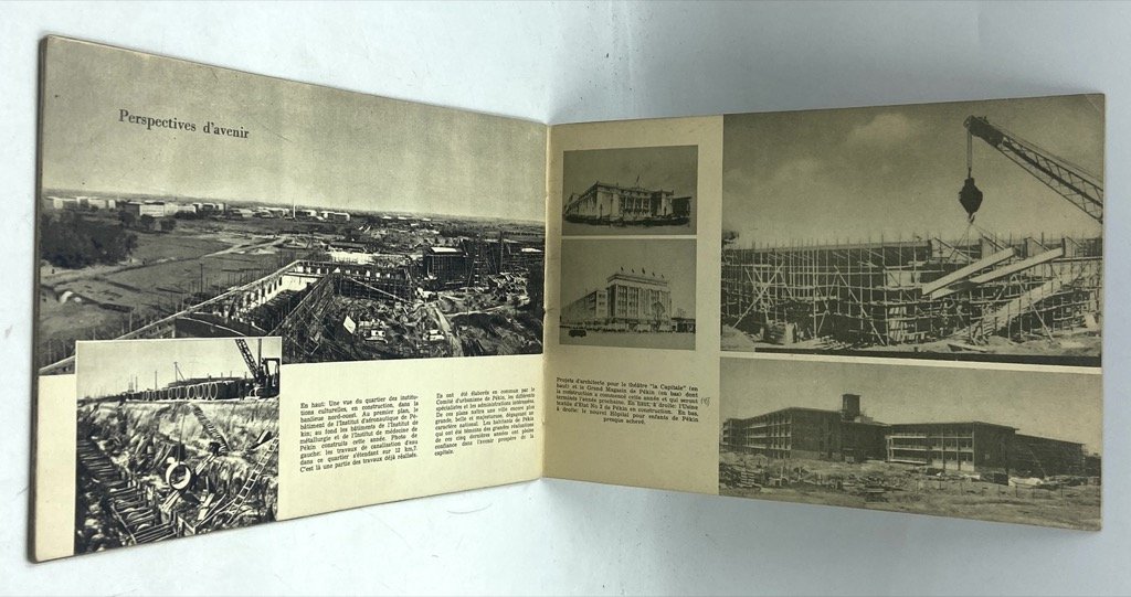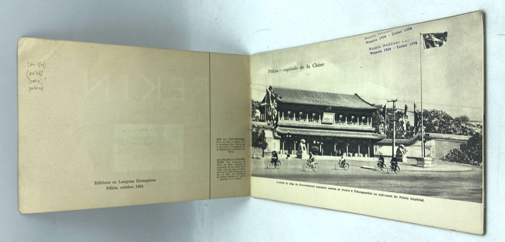 Opuscolo turistico in brossura illustrata, cucitura a vista sul dorso con laccetto rosso, formato album cm 18.5 x 26, pp 32 illustrate a colori e in nero. Testo in francese. Timbretto sulla prima pagina (vedi foto) e alcune note a lapis e penna, peraltro in buono stato. Opuscolo turistico, stampato dalle Edizioni in Lingue Straniere di Pechino nell’ottobre 1954, che illustra con brevi didascalie e molte immagini a colori e in nero vari aspetti della vita della capitale: la sede del governo con una riunione presieduta da Mao (Pékin, capitlae de la Chine), le nuove costruzioni e gli ammodernamenti urbanistici (Le nouveau visage de Pékin), la festa del Primo Maggio in piazza Tien An Men, lo sviluppo economico e manufatturiero (L'Edification industrielle de Pékin), gli eventi sportivi, le biblioteche, l'università e le scuole, gli spettacoli, i commerci.