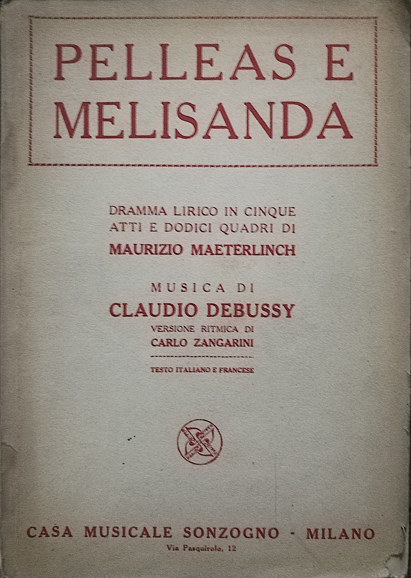 COD. 5560 Brossura, Pagg. 87 Libretto d'Opera, musica di Debussy, versione ritmica di Zangarini. Condizioni abbastanza buone, tracce di polvere e usura alla coperta, pagine ingiallite in buono stato - lingua: italiano - francese Kg. 1