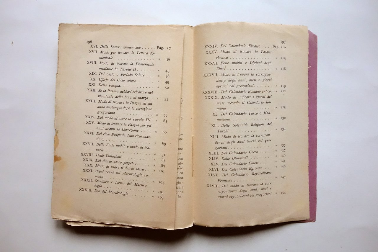 Sac. Pellegrino Tosatti, il Calendario Perpetuo accomodato all'intelligenza di tutti con cenni storici e osservazioni [.] Tip. Pontificia dell'Immacolata Concezione, Modena 1883; cm 22,5x14,5; pp. 200 con IX tavv. fuori t. o su due pagine, di cui una ripiegata pi√π volte; brossura ed. Condizioni di conservazione Buone condizioni con tracce d'uso; brossura con leggerissime bruniture, minuscoli difetti e mancanze agli angoli, mancanza di qualche cm al margine inf. della brossura ant.; dorso con fessurazioni e leggermente ingiallito, esemplare complessivamente compatto. Interni buoni con lieve foxing; pp. 193-196 staccate dal corpo del testo. SETT75.L25382 N