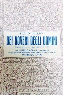 Silvio Pellico, Dei doveri degli uomini. Edizione esemplata sulla principe del 1834, con Postille morali a vari capitoli tratte dall’Epistolario dello stesso Autore, a cura di Manfredo Vanni, Carlo Signorelli Editore,Milano1930, pp. 70, cm 20, br. ed. Piccola mancanza alla copertina, per il resto esemplare ben conservato.
