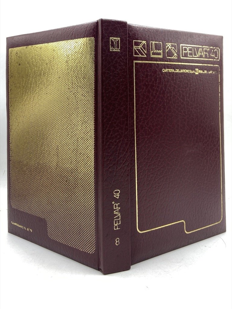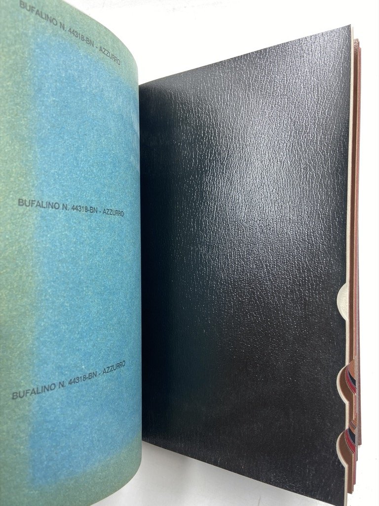 Campionario di similpelle Pelvar 40 per legatoria, cm 24 x 16, 69 campioni di vare finiture del materiale (Madras, Pecari, Bufalino, Nappa, Capretto, Alpaca) in diversi colori, con dati tecnici sulla prima sguardia.