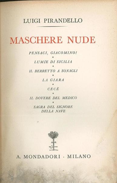Collana "Tutto il teatro di Luigi Pirandello" VII. Legatura allentata. Esemplare segnato notevolmente dall'umidità (corpo ondultato e macchie e stese). Bordi stanchi ed evidenti segni del tempo all'esterno