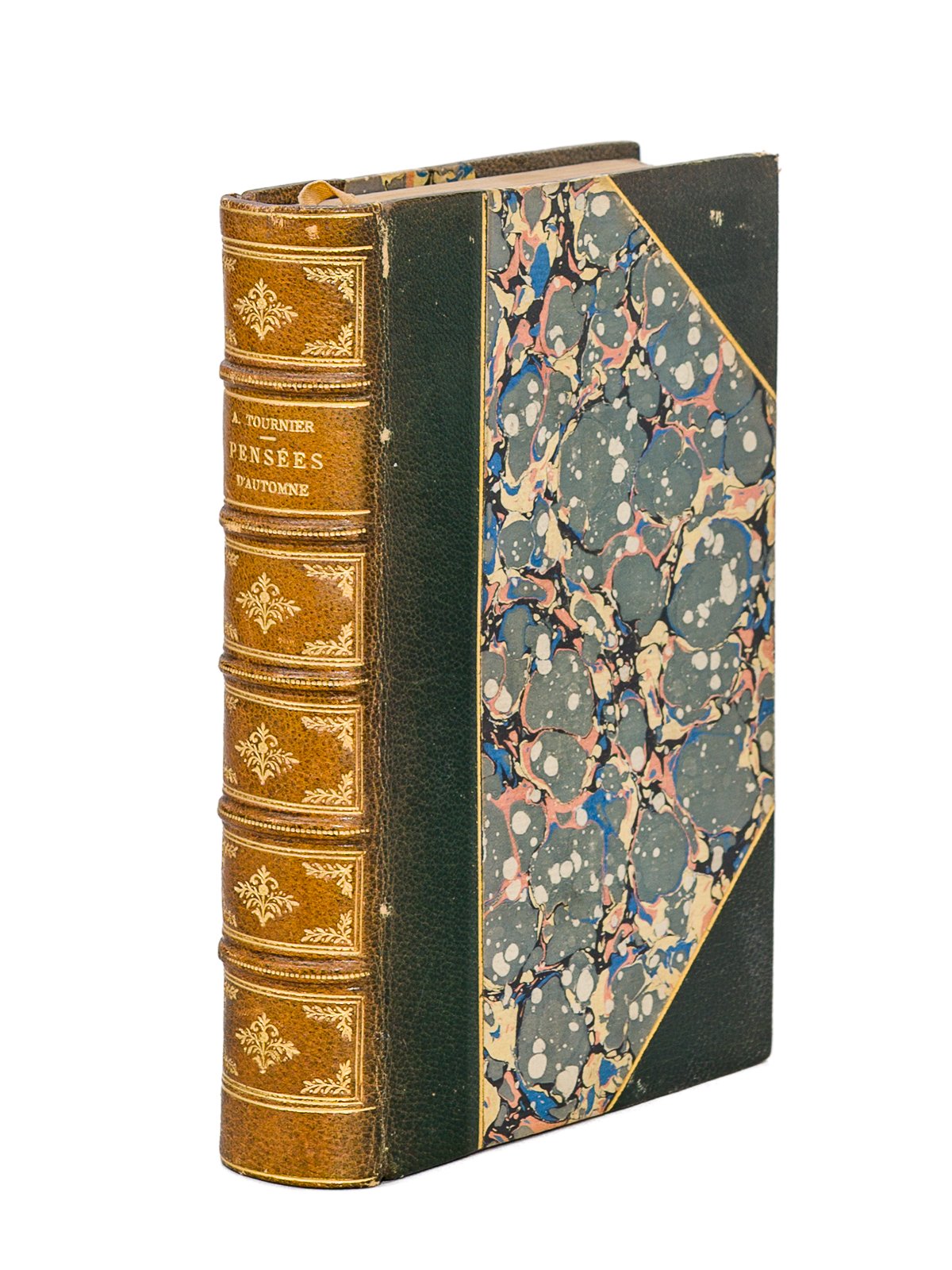 1 vol. in-18 reliure de l'époque demi-maroquin à coins brun, dos à 5 nerfs orné, tête dorée, filet doré en mors et coins, Paul Ollendorff, Paris, 1900 (achevé d'imprimer en juillet 1899), XXXVIII-465 pp. Envoi de l'auteur à M. Méline. Avocat, Achille Tournier fut notamment préfet de la Sarthe, de l'Isère ou de la Somme. Ce recueil de pensée porte sur les femmes et l'amour, la politique (« Grâce à la bureaucratie et au socialisme, il n'y aura bientôt que deux partis en France : ceux qui vivent de l'impôt et ceux qui en meurent ») ou sur le chat ! Bon état (dos passé, bon exemplaire par ailleurs). On joint une carte en souvenir du député Albert Jacquemin.