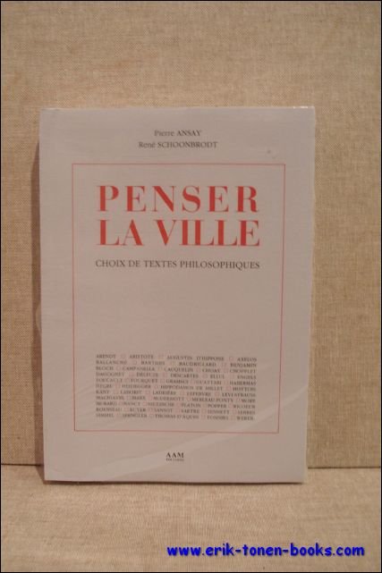 Edition brochee, 150 x 210 mm., 479pp. ISBN 9782871430659. Cette anthologie cherche a depister la pensee philosophique sur la ville et a la faire emerger des sediments qui la cachent, au travers de textes de plus de cinquante philosophes. Elle repond a un besoin de penser la ville a nouveau et mieux. Textes de : Arendt, Aristote, Augustin d'Hippone, Axelos Ballanche, Barthes, Baudrillard, Benjamin Bloch, Campanella, Cauquelin, Choay, Chopplet, Dagognet, Deleuze, Descartes, Ellul, Engels, Foucault, Fourquet, Gramsci, Guattari, Habermas, Hengel, Heidegger, Hippodamos de Millet, Hottois, Kant, Laborit, Ladriere, Lefebvre, Levi-Strauss, Machiavel, Marx, McDermott, Merleau-Ponty, More, Murard, Nancy, Nietzsche, Platon, Popper, Ricoeur, Rousseau, Ruyer, Sansot, Sartre, Sennett, Serres, Simmel, Spengler, Thomas d'Aquin, Tonnies et Weber. Nouveau livre