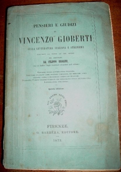 Volume in 8, brossura editoriale, titolo al piatto ed al dorso, occhiello, frontespizio, XXXV, 491 pp. Tutto quanto il grande pensatore e filosofo ha lasciato scritto sulla letteratura italiana e straniera antica e moderna nelle sue molteplici opere. Opinioni, veri e propri saggi, considerazioni e pensieri, chiose ed annotazioni raccolte con pervicacia e perspicacia dal curatore di questo volume. Un'antologia necessaria per poter comprendere il pensiero del Gioberti e la cura che egli ebbe nel confrontarsi con i Grandi. In bello stato, poche ininfluenti mende d'uso, solo un po' allentato, interessante.