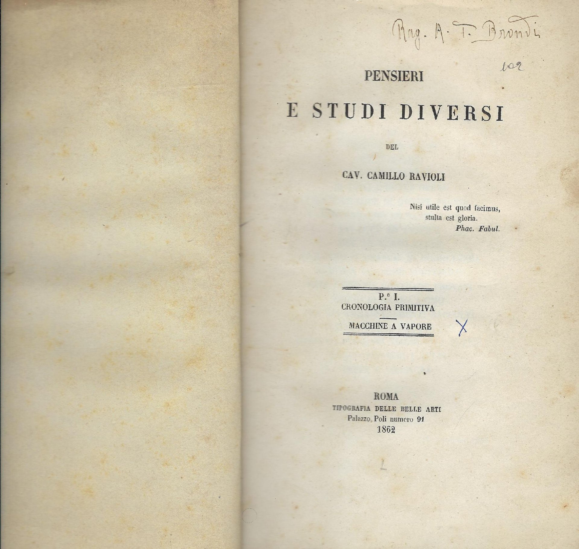 102 p. ; 23 cm . Due saggi su: Cronologia primitiva e Macchine a vapore Molto buono (Very Good) brossura muta in carta fiorita, manca copertina originale e sguardia finale, piccola scritta sul frontespizio, pagine interne in perfetto stato.