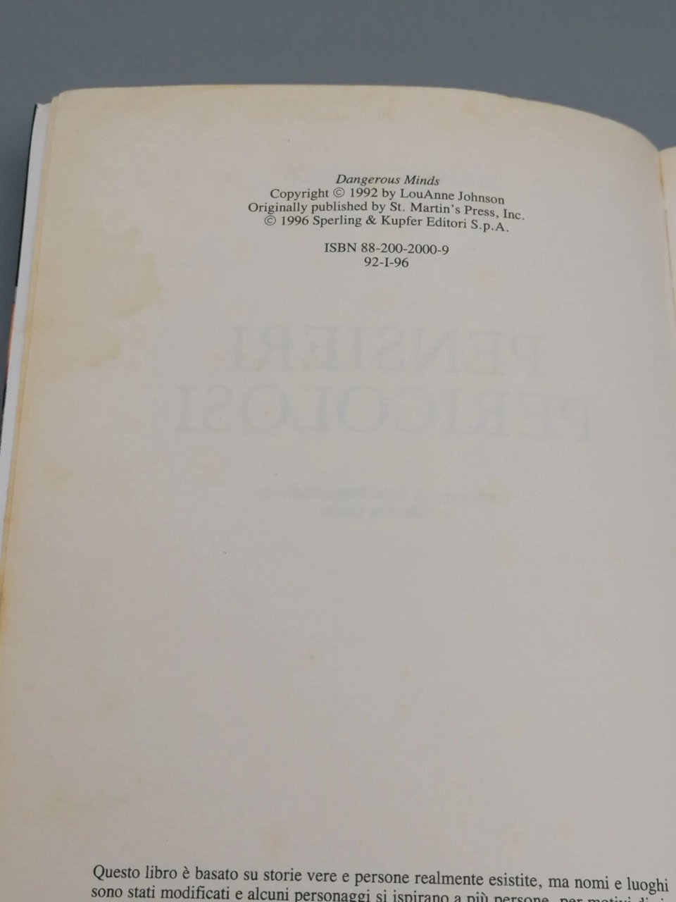 Pensieri pericolosi (Dangerous minds)di LouAnne JohnsonEditore: Sperling & Kupfer Collana: Narra Data di Pubblicazione: 1996 ISBN: 8820020009 Pagine: 254 Formato: brossura 1H-4-3 Condizioni del libro Condizioni accettabili: libro piuttosto ingiallito (vedi foto).