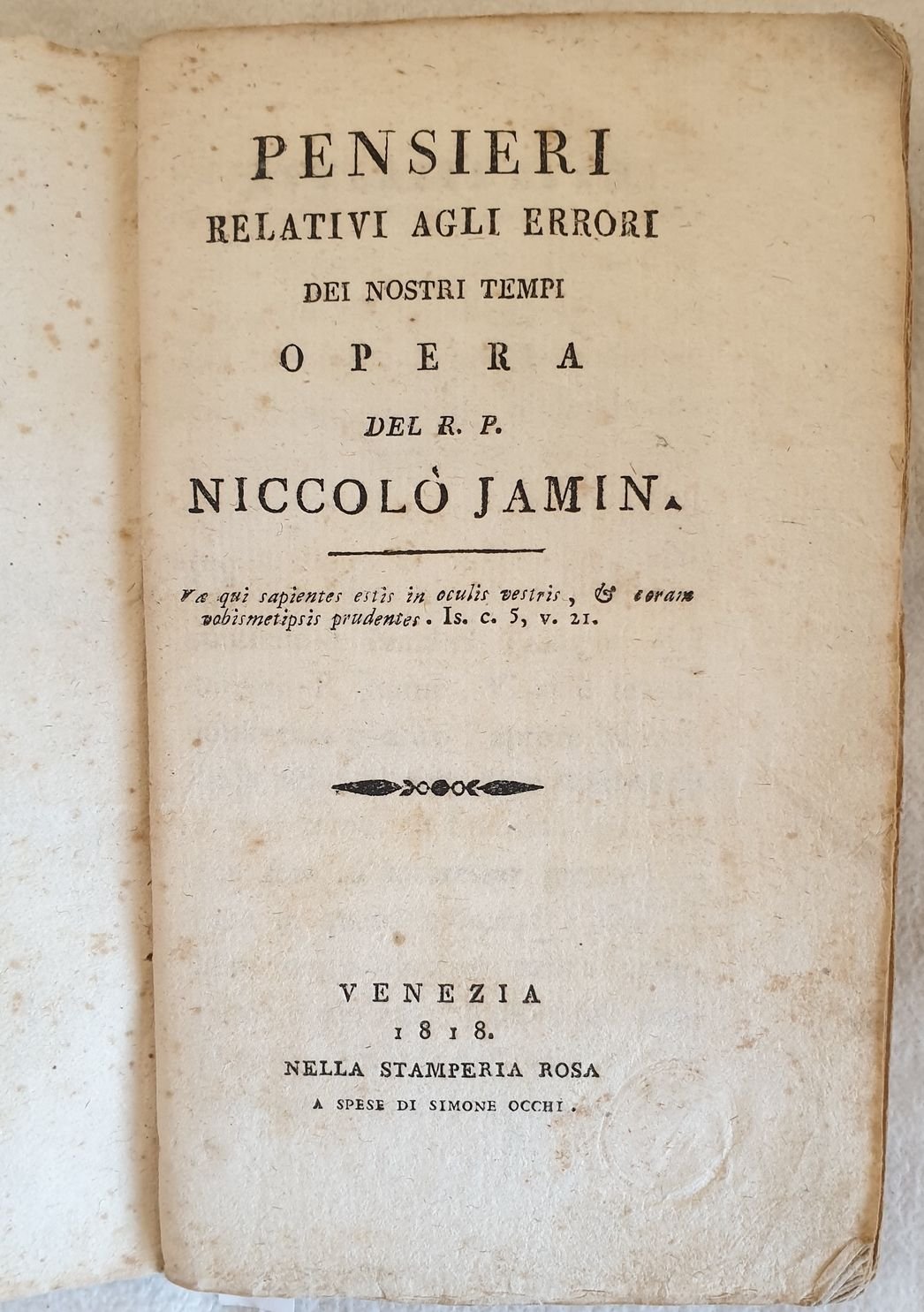 Edizione del 1818 di questa opera teologica di Nicolas Jamin. Si tratta di alcuni pensieri teologici sulla divinità, Chiesa, Depositari dell'autorità, Findamento dei giudizi, Misteri, Eresia, Profezia, miracoli, Fede, religione, Spiriti forti ecc. In buone condizioni. Copertina morbida coeva in buone condizioni generali con usure ai margini, piatti e dorso. Legatura in buone condizioni. All'interno le pagine si presentano in buone condizioni con fioriture. In 16. Dim. 17,5x10,5 cm. Pp. 307+(1). Edition of 1818 of this theological work by Nicolas Jamin. It is some theological thoughts. In good conditions. Soft coeval cover in good general conditions lightly worn in the extremities. Binding in good conditions. Inside pages are in good conditions with foxing. In 16. Dim. 17,5x10,5 cm. Pp. 307+(1).