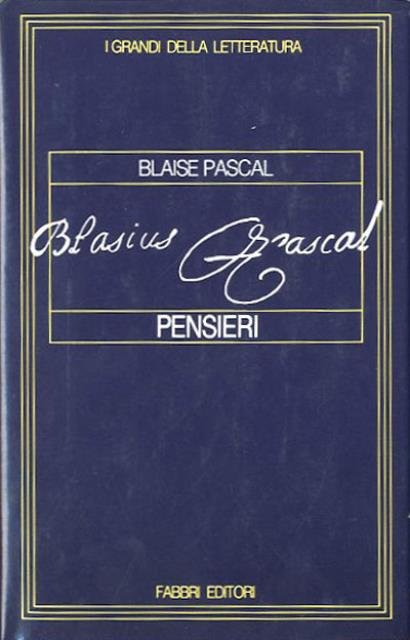 295 p. ; 20 x 13 cm. I grandi della letteratura, 60. I "Pensieri" sono un'opera incompiuta del filosofo e teologo francese Pascal, considerato il padre degli esistenzialisti moderni. L'opera venne pubblicata postuma nel 1670. Seconda ristampa stereotipa di I edizione di 1936. Titolo originale dell'opera: «Pensées». Traduzione di Franco De Poli. Legatura editoriale, coperta in cartone rigido telato di colore grigio, titolo riquadrato impresso in oro al dorso, muto il piatto. Sovraccoperta a colori in carta plastificata lucida con alette. Codice libreria 4523.