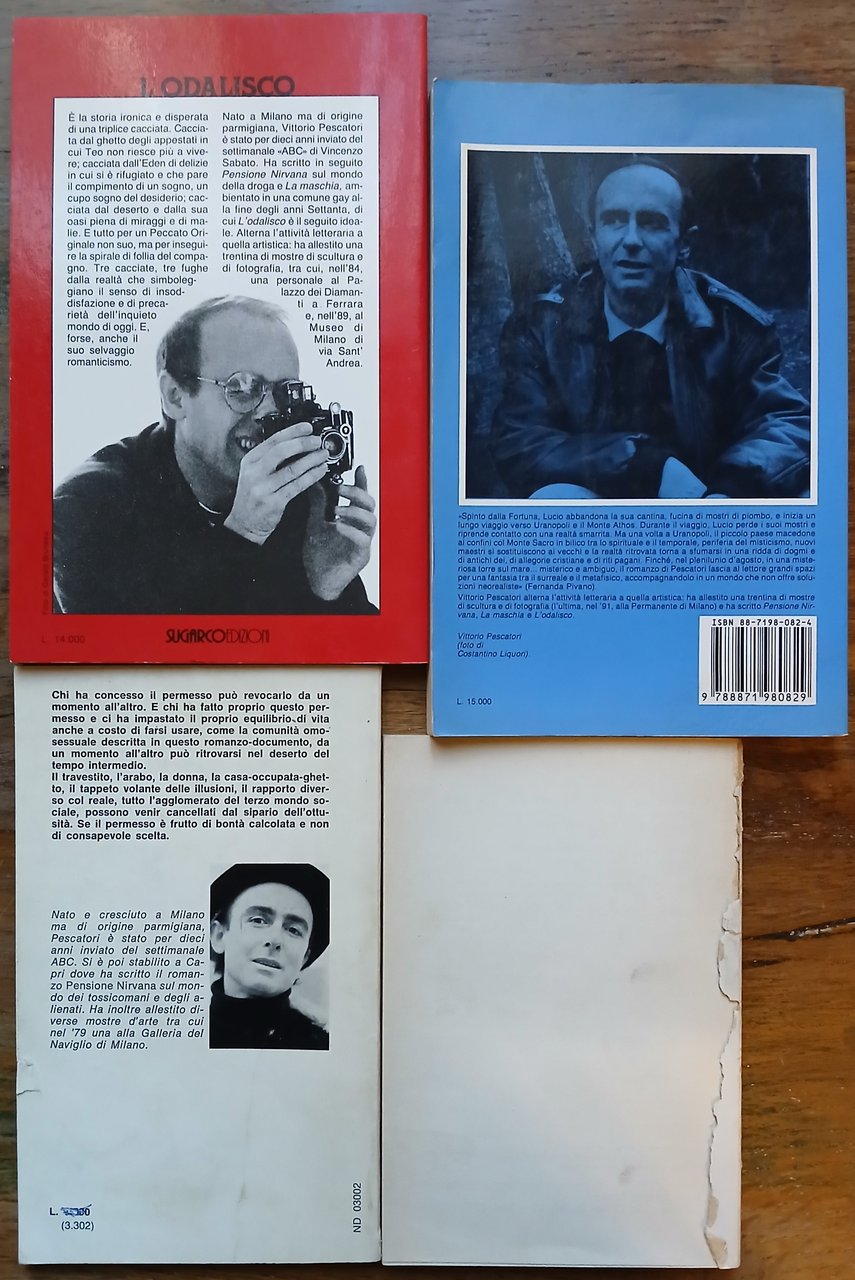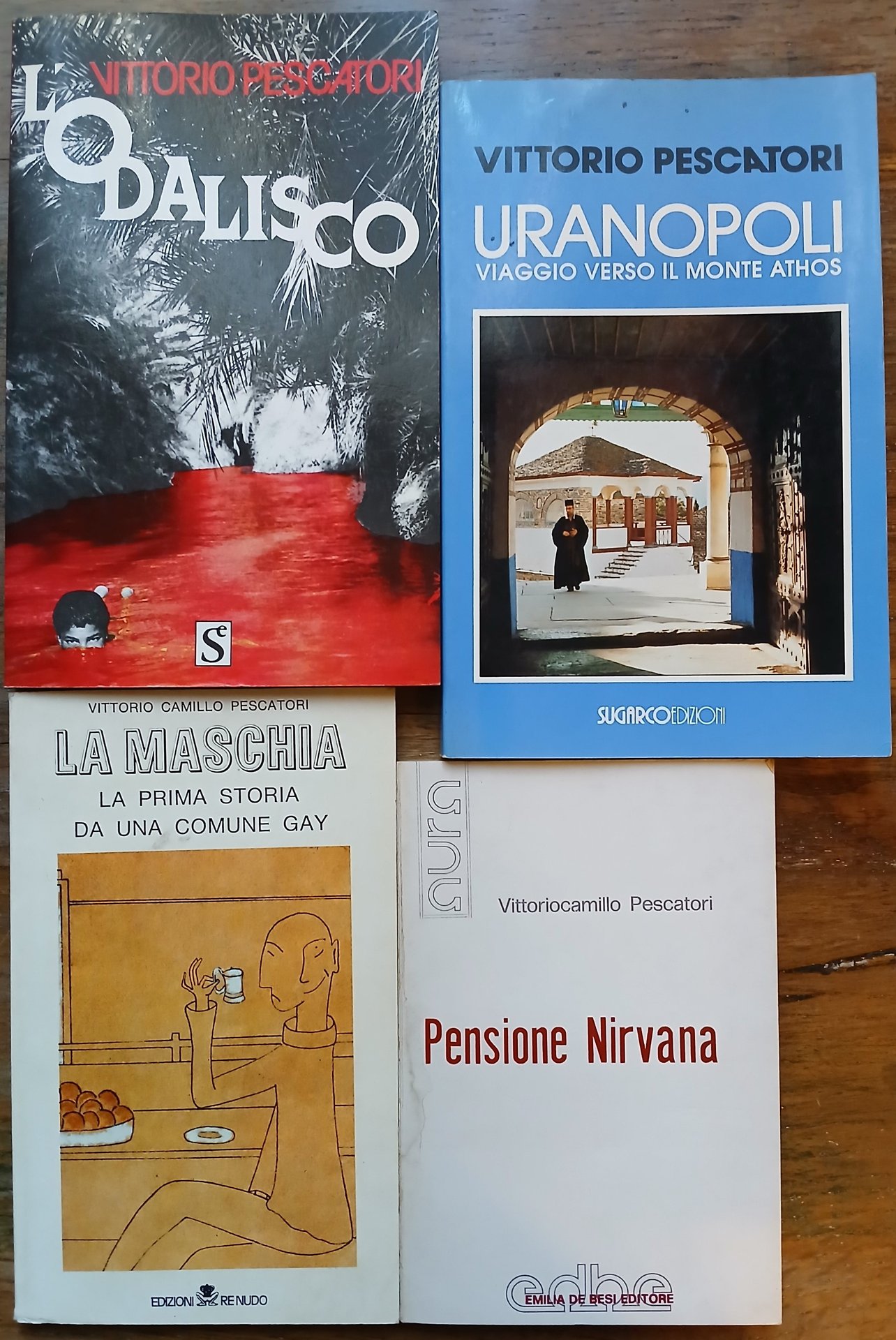 Quattro opere di Vittorio Camillo Pescatori in prima edizione. "Pensione Nirvana", Bologna, Emilia De Besi Editore, 1975, dedica autografa dell'autore, manca la seconda di copertina. "La maschia. La prima storia da una comune gay", Milano, Edizioni Re Nudo, 1979, dedica autografa dell'autore, in ottimo stato. "L'odalisco", Milano, SugarCo Edizioni, 1989, in ottimo stato. "Uranopoli. Viaggio verso il Monte Athos", Milano, SugarCo Edizioni, 1991, dedica autografa dell'autore, in ottimo stato.