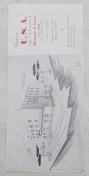 Pieghevole di 6 facciate di cm. 21,5 x 10; con illustraz. fotograf. e disegni in colore; copertina figurata. VG. ** "La Pensione U.S.A. è una costruzione moderna in prima linea sul mare. Rinomata per l'ottima cucina emiliana". Gest. Propr. F.lli Sensoli.