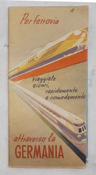 Pieghevole di 30 facciate di cm. 21 x 9; con, su un lato completamente aperto, carta a colori della Germania animata; al verso cartina delle linee principali e disegni a colori; copertina grafica a colori. VG.